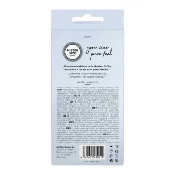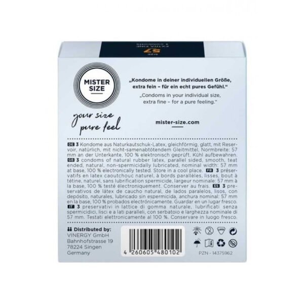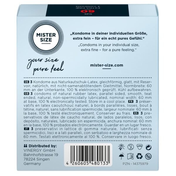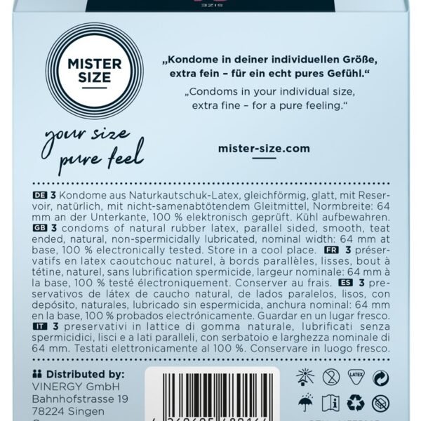 Німецький бренд MISTER SIZE — це презервативи найвищої якості, виготовлені з унікальної суміші натурального каучукового латексу, яка надає виробу додаткової м’якості, стійкості до розривів та мінімізує запах. Товщина латексу 0,05 мм — практично не відчувається під час близькості. Як змазка використовується чистий силікон — диметикон. Презервативи MISTER SIZE дають змогу ідеально підібрати відповідний розмір, оскільки випускаються в 7 розмірах: 47, 49, 53, 57, 60, 64 та 69 мм. Продукція MISTER SIZE розробляється та виробляється в Малайзії на сучасному обладнанні під контролем досвідчених фахівців на найбільшому у світі виробництві презервативів. Кожен презерватив MISTER SIZE проходить електронну перевірку на наявність отворів. MISTER SIZE — сертифікований медичний продукт відповідно до директиви ЄС 93/42 EEC. На додаток до внутрішнього контролю якості всі системи виробництва та управління регулярно та офіційно перевіряються відповідно до стандартів ISO 9001 та ISO 13485. Презервативи MISTER SIZE представлені на ринку понад 20 років. Перший інтернет-магазин із системою пошуку презервативів компанія відкрила в Німеччині ще у 2001 році, і він швидко завоював популярність по всій країні, а потім і Європі. Продукція MISTER SIZE є eco-friendly та vegan-friendly.