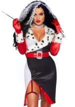 Костюм Devilish Dog Diva складається з трьох частин: сукня із запахом та оздобленням зі штучного далматинського хутра, ремінець з підв’язками з мулу, прикріплений пояс із пряжкою зі страз, кольє зі стразами та манжети зі штучного хутра на зап’ястях.