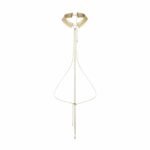 Витончене кольє виконане з маленьких металевих намистин, від кільця кольє тягнуться витончені ланцюжки, які легко огортатиме талію, роблячи при цьому виразний акцент у зоні декольте.