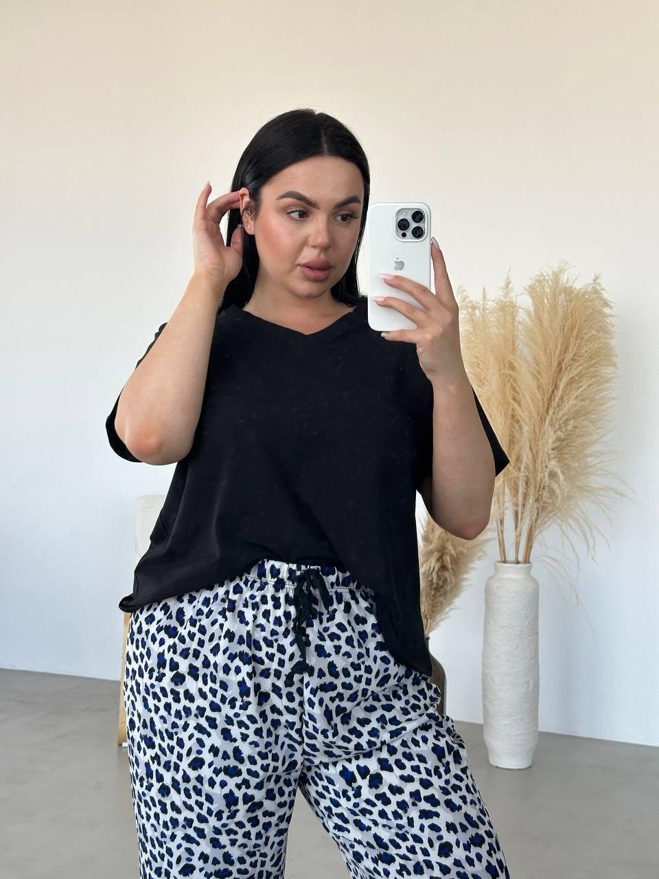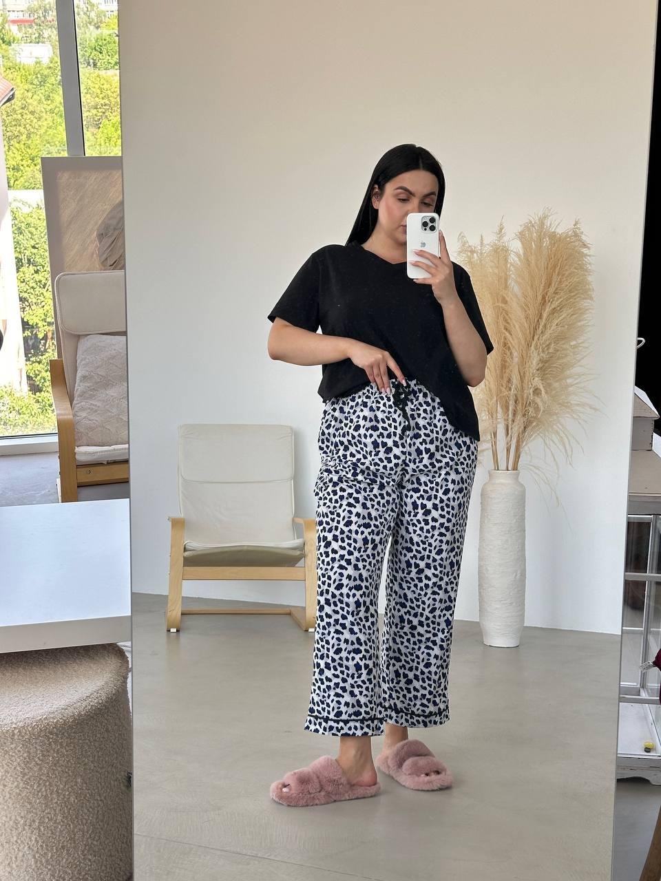 зручна та висока посадка у штанців, футболка вільного крою
