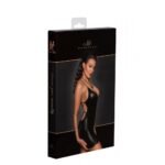 Бренд Noir Handmade відомий handmade виробництвом одягу з високоякісного вінілу, який відрізняється розкішними дизайнами та винятковою якістю пошиття. Гардероб кожної жінки не обходиться без чорної міні-сукні, проте не кожна зважиться з’явитися на світському заході саме у такій сукні з відкритою спиною та глибоким декольте. У ньому ваш образ буде незабутнім і напевно унікальним! Матеріал щільно прилягає до тіла і облягає найпривабливіші округлості, особливо підкреслюючи груди та сідниці. V-подібний декольтований виріз у поєднанні з м’якими філіжанками ліфа без ущільнювачів і кісточок створює елегантний, збуджуючий вигляд бюста. Тонкі бретелі акцентують увагу на витонченості плечей та ключиць. На відкритій спині передбачено переплетення бретелів, які зав’язуються на попереку. Доповнити образ вам допоможуть панчохи в сітку або ви можете підібрати спеціальні вінілові панчохи Noir Handmade, якщо хочете підкорити партнера своєю домінантністю в ліжку.