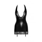 Еротична вінілова міні-сукня з мереживом та підтяжками для панчох F280 Noir Handmade, з глибоким декольте, чорна, S