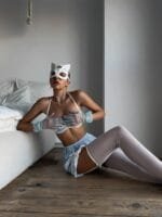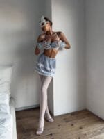 Ніжний блакитний комплект із мереживними деталями та елегантною прозорою спідничкою втілює чарівність і граційність. Аксесуари додають образу загадковості, створюючи ідеальний баланс між романтикою та грайливістю