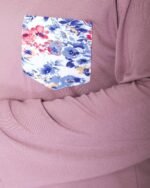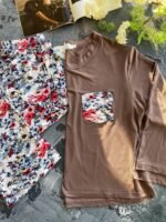 Комплектація: кофта кольору мокко з маленьким карманом та білі штани з квітковим візерунком.