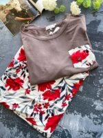 Комплектація: кофта кольору мокко з маленькою кишенею та штани з квітковим візерунокм.